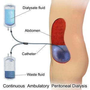 Peritoneal Dialysis is performed thru a thin catheter that is placed into a space low in your abdomen and extends outside your body as a permanent tube. Dialysis is performed by you or a caregiver in your own home. A bag of fluid is drained into your body thru this catheter and while it is there, it pulls excess fluid and toxins out of your blood. After a few hours, this fluid is drained out of your body by gravity. This fluid is yellow and looks just like urine. These exchanges are performed a few times thru the day or automatically with a machine as you sleep.