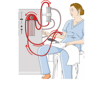 Hemodialysis is performed thru a surgically created access in your lower or upper arm. This access involves a vessel in your arm which will allow you or a caregiver to put 2 needles into it and run blood from your body thru a filter and then back to your body. This circuit is connected and runs continuously for a few hours (typically 3-4 hours) before the blood is then returned to your body and the needles are removed. This procedure can be performed in your home or at a dialysis clinic 3-5 days weekly.